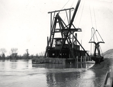 By the turn of the 20th Century, the sidedraft-clamshell dredge was used to remove material from riverbeds to increase the size of levee barriers. These Delta levees are built on a foundation of sand, silt and peat which make them susceptible to erosion, seepage and breaks.